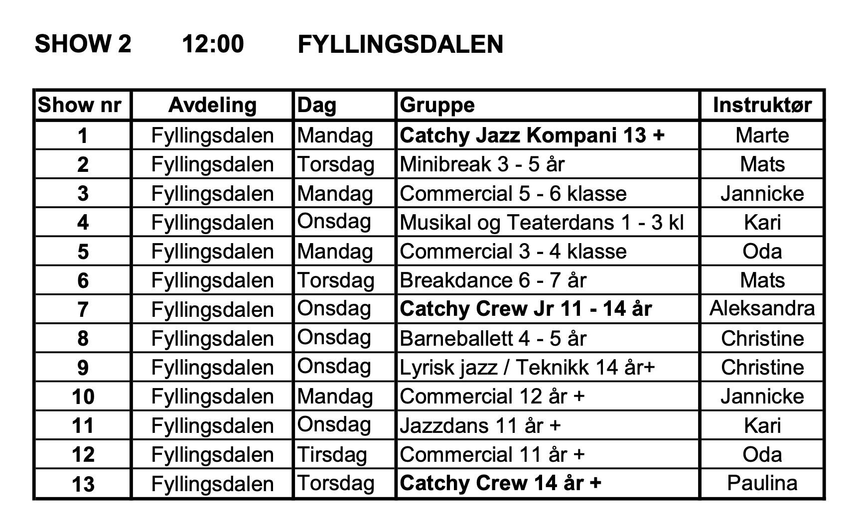 Elevene MÅ møte 11.30 ved inngang. De må komme ferdig påkledd og sminket. Noe kostymer ligger klart på tildelte rom hvor elevene skal oppholde seg. Se etter din instruktør og assistent.
