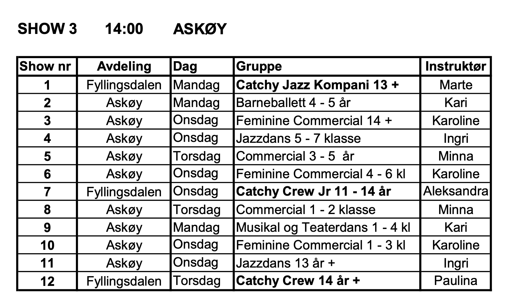 Elevene MÅ møte 13.30 ved inngang. De må komme ferdig påkledd og sminket. Noe kostymer ligger klart på tildelte rom hvor elevene skal oppholde seg. Se etter din instruktør og assistent.